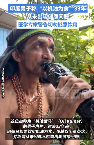 印度男子称每天喝机油连喝33年 医学专家警告勿模仿