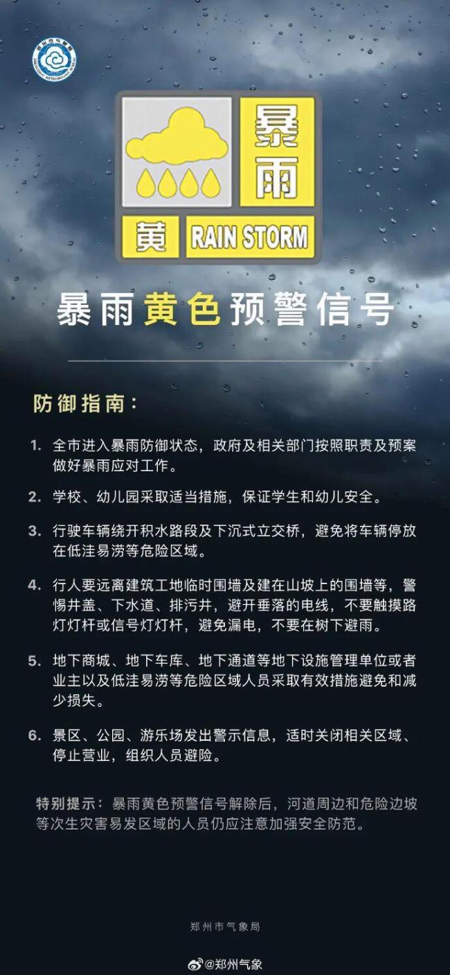 降水量将超50毫米 郑州发布暴雨黄警 强对流天气来袭