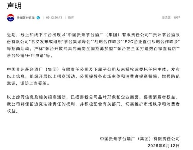 贵州茅台严正声明:近日加盟及直采飞天均为虚假信息