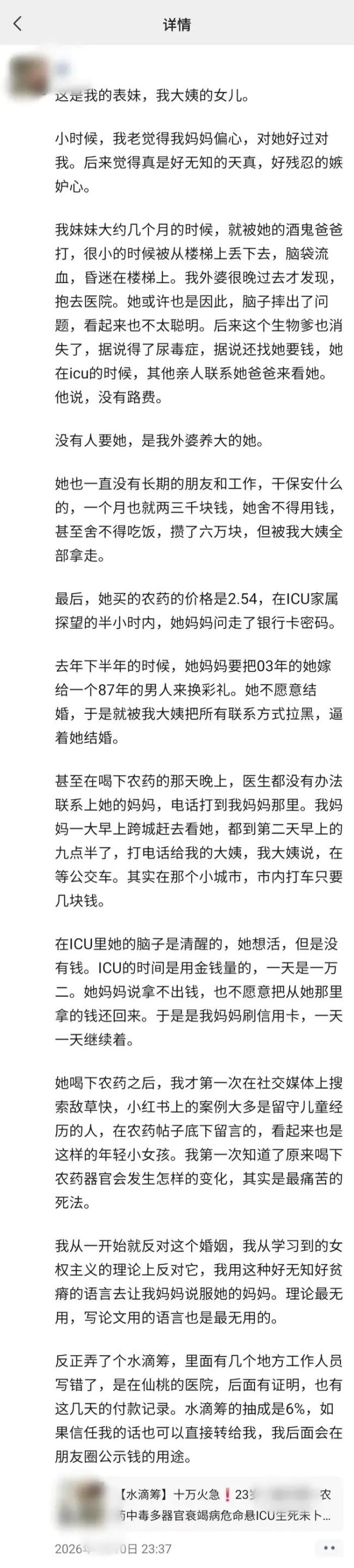 近日,多张求助截图在网络上引起广泛关注。一名23岁的女子因被母亲逼迫嫁给一名39岁的男子而喝下农药敌草快轻生。她的亲人无力承担高额的治疗费用,发起了众筹
