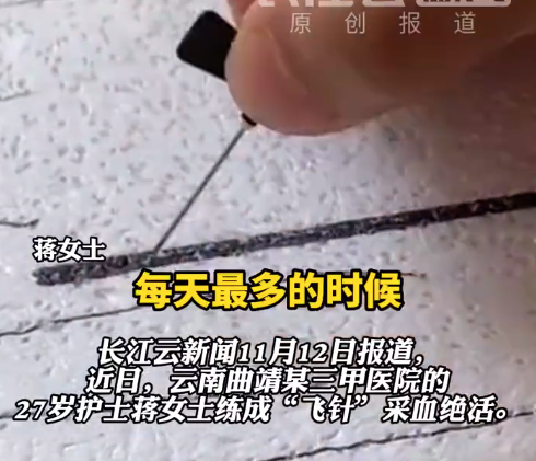 近日,云南曲靖某三甲医院的27岁护士蒋女士练成“飞针”采血绝活。蒋女士告诉长江云新闻记者,这项技术看似简单,却是她每天在泡沫板上练习6000多次、总共扎出10万多个针孔才练成的。她表示,为了让患者少一点疼痛,从最初在泡沫板上练针,到与同事互...