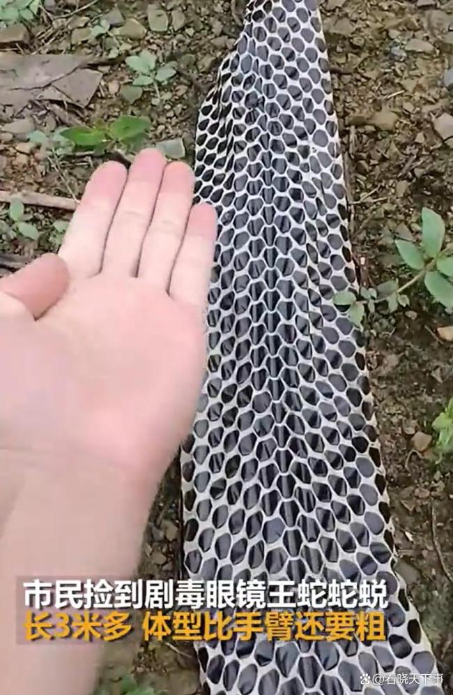 在广西来宾,一名男子在上山途中发现了一个黑白格的长条物体。起初他以为是塑料袋,走近一看才发现是一条相当完整的眼镜王蛇蛇蜕。这条蛇蜕长度大约三米多,比手臂还要粗,重量约18斤
