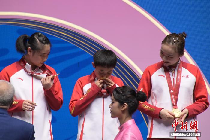 图为山东队选手范思琦(中)亲吻奖牌。中新网记者 陈永诺 摄 图为河北队选手孙颖莎(左一)在比赛中庆祝。中新网记者 陈永诺 摄