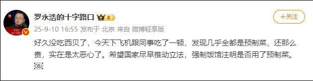 罗永浩在社交媒体上批评西贝的菜品几乎全是预制菜且价格昂贵,呼吁国家推动立法强制餐馆注明是否使用了预制菜。这一言论再次引发了公众对预制菜的关注