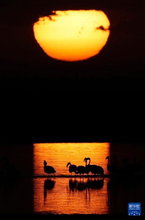 这是12月6日日出时分在埃及法尤姆省加龙湖拍摄的火烈鸟。 每年冬季,大批火烈鸟会飞抵埃及法尤姆省内的加龙湖觅食越冬。 新华社发(艾哈迈德·戈马摄)