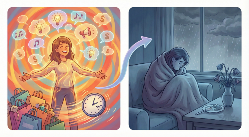 前段时间,我的公益倾听的邮箱里收到了一条很长的信。来信人说:「我不知道我另一半到底怎么了,我觉得是真快被折磨疯了。上个月突然像打了鸡血一样,每天只睡三四个小时,凌晨两点还在客厅拉着我聊他刚想到的创业。感觉好像突然就变得特别自信,甚至可以说是...