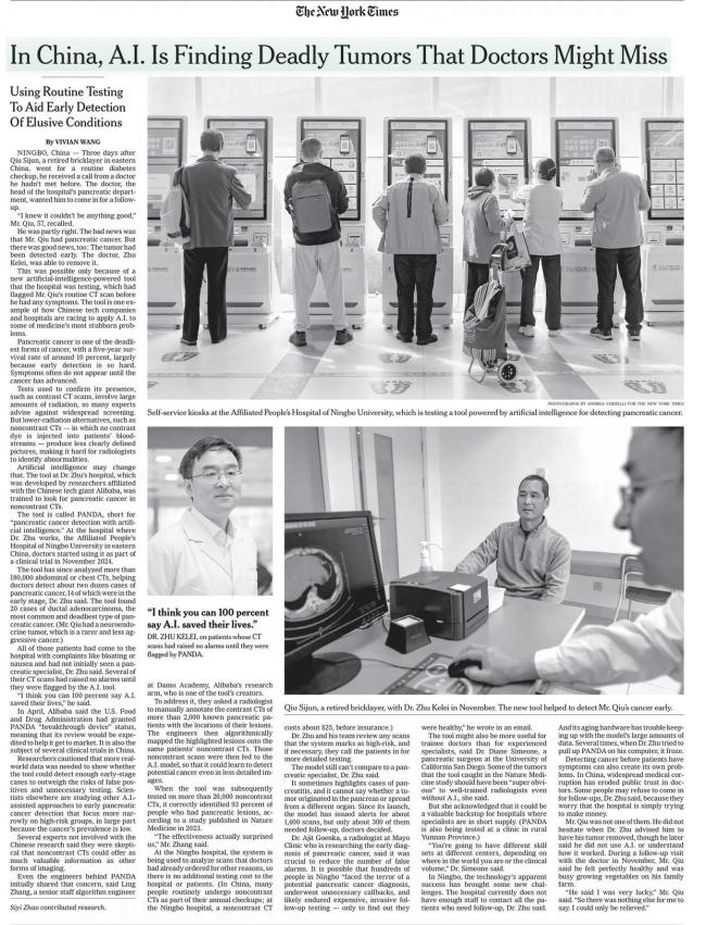 当地时间1月2日,美国《纽约时报》发表整版报道,介绍了阿里巴巴研发的胰腺癌早筛AI模型。该模型帮助医生发现了原本可能遗漏的致命肿瘤,挽回了多名患者的生命。这篇报道在美国网友中引起广泛关注,许多人认为这是新兴技术的正确应用